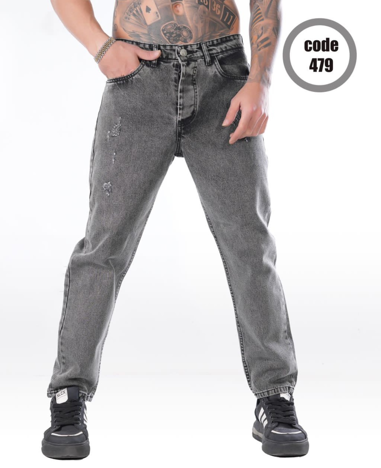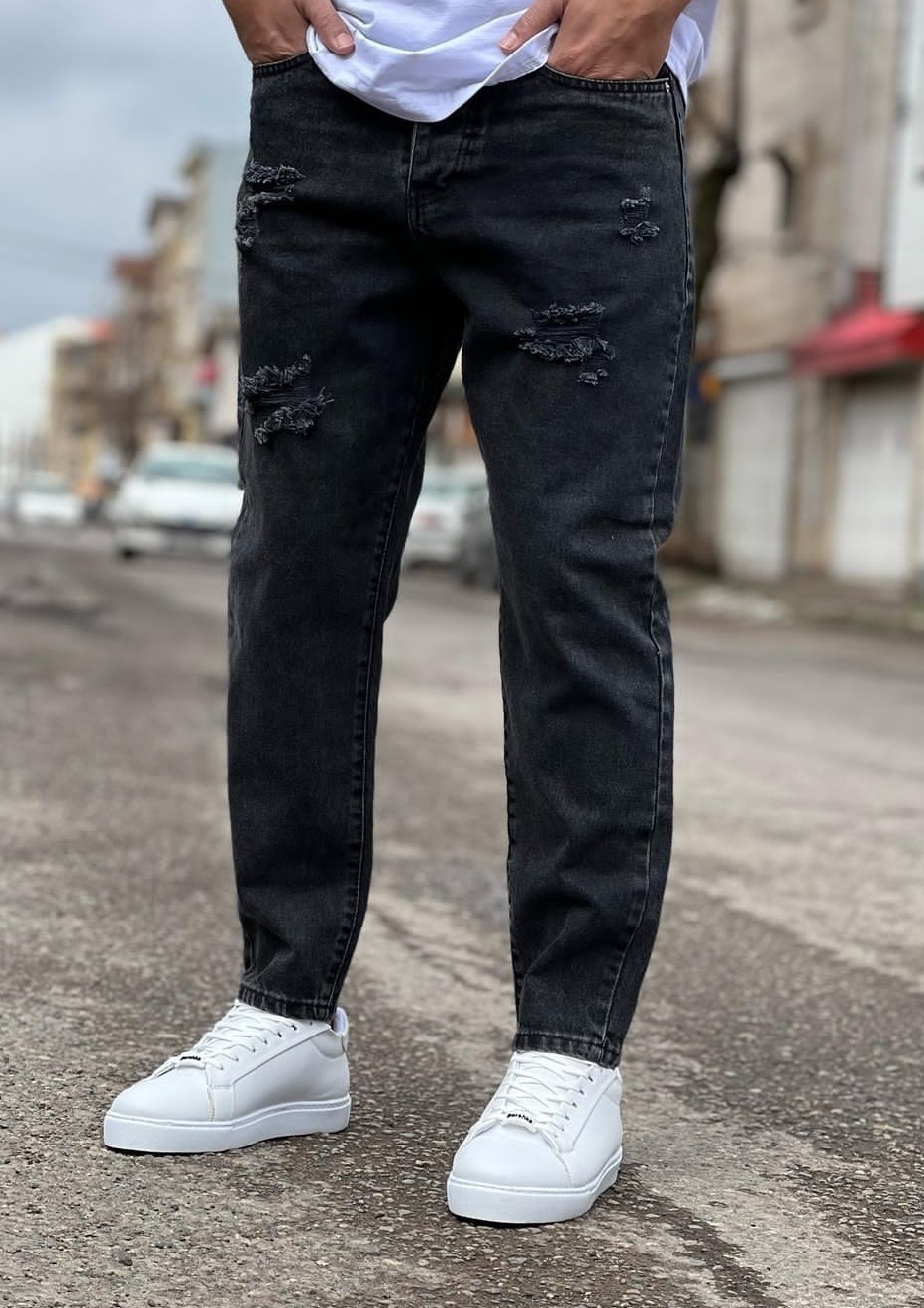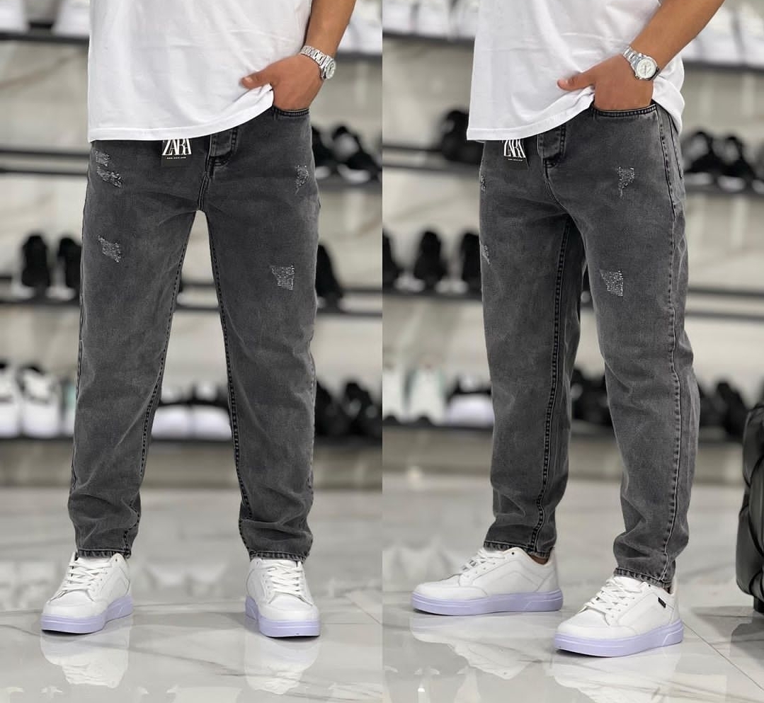 شلوار مام فیت ذغالی زاپ پاره مردانه پارچه کجراه پنبه گرماژ بالا کد ۶۹