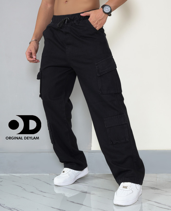 شلوار کارگو مشکی مردانه پارچه جین کجراه پنبه کد ۵۵۴